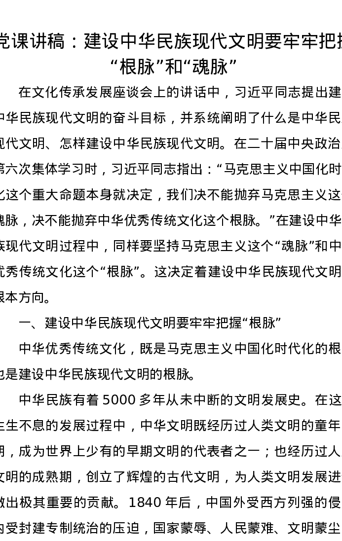 党课讲稿:建设中华民族现代文明要牢牢把握“根脉”和“魂脉”