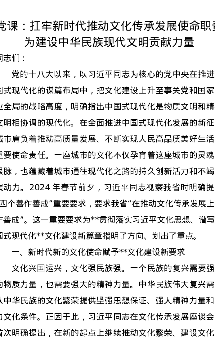 党课讲稿:扛牢新时代推动文化传承发展使命职责为建设中华民族现代文明贡献力量