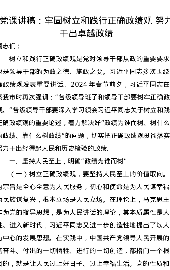 党课讲稿:牢固树立和践行正确政绩观,努力干出卓越政绩