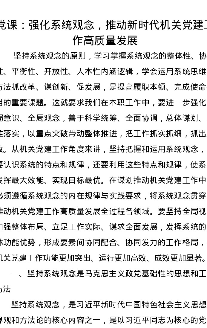 党课讲稿:强化系统观念,推动新时代机关党建工作高质量发展