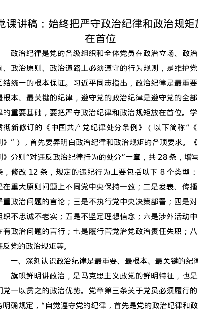 党课讲稿:始终把严守政治纪律和政治规矩放在首位