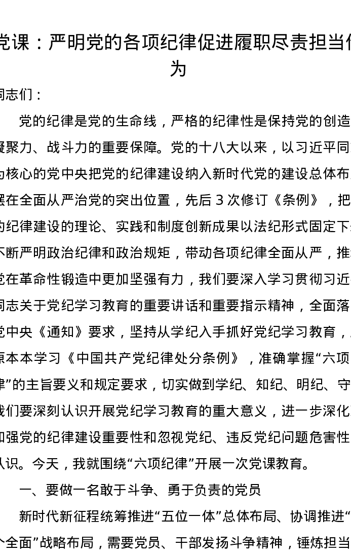 党课讲稿:严明党的各项纪律促进履职尽责担当作为