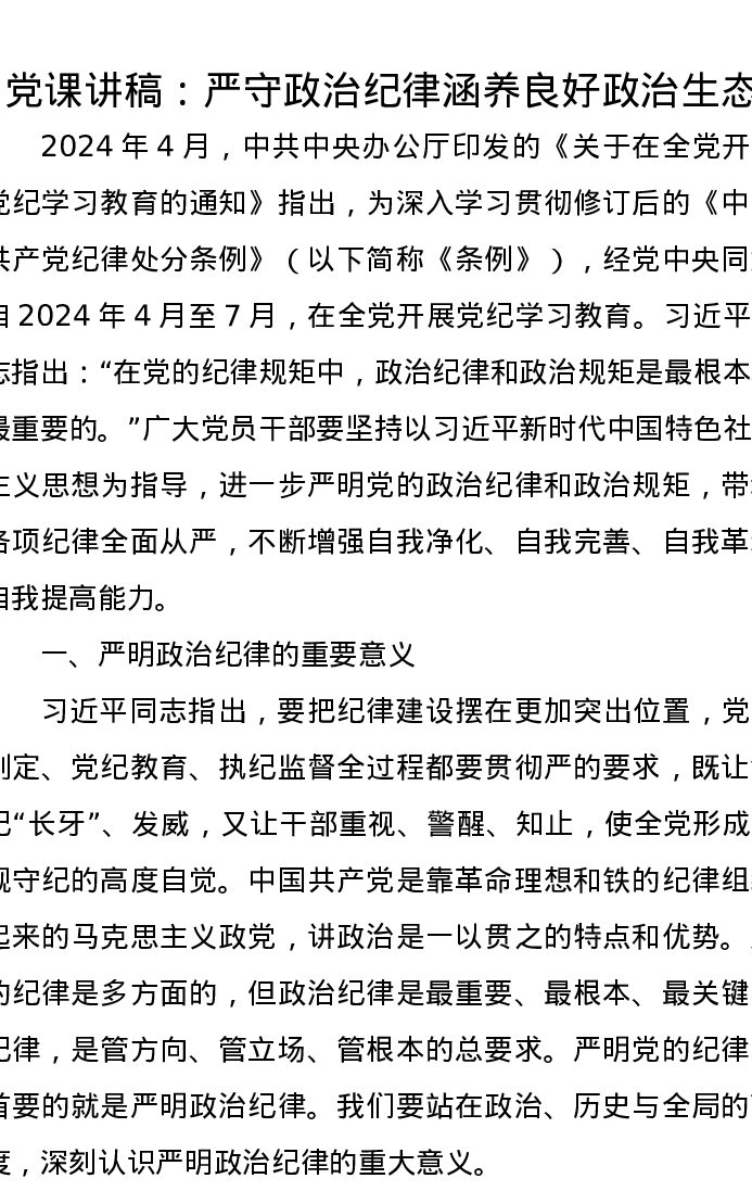党课讲稿:严守政治纪律涵养良好政治生态
