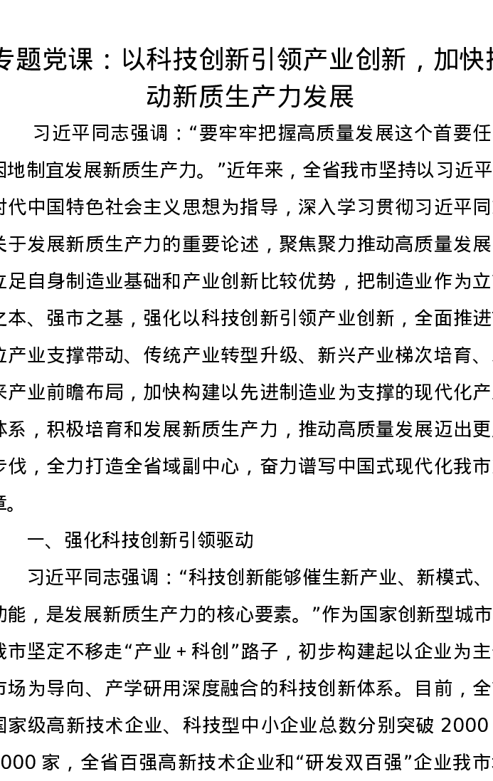 党课讲稿:以科技创新引领产业创新,加快推动新质生产力发展