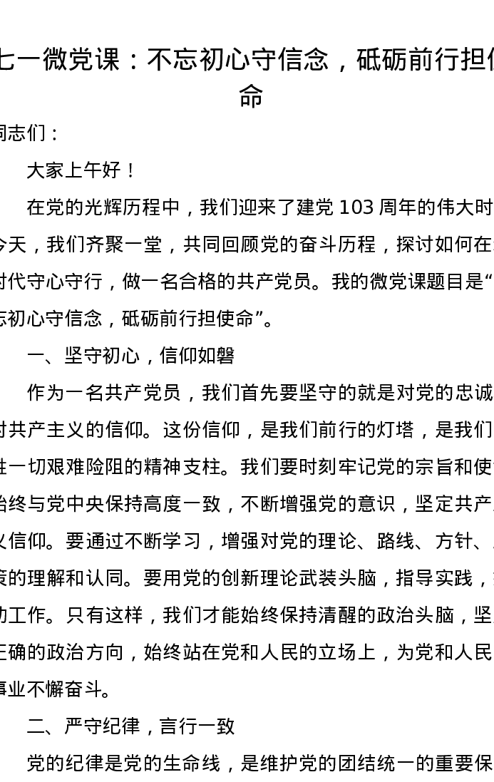 七一微党课讲稿:不忘初心守信念,砥砺前行担使命