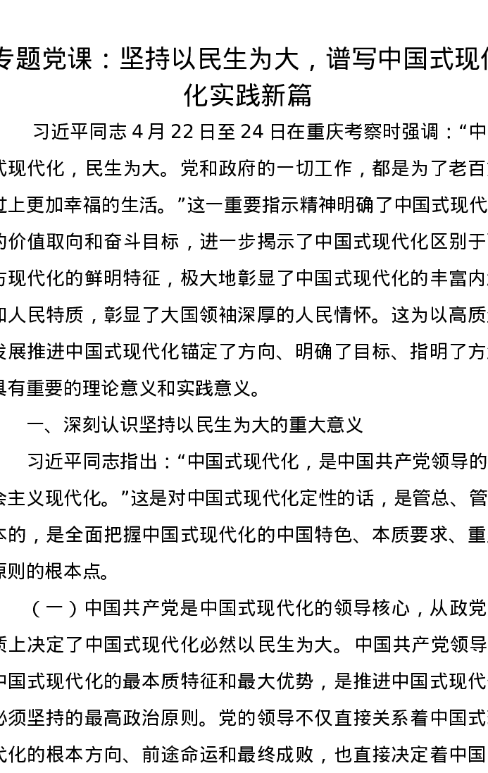 专题党课:坚持以民生为大,谱写中国式现代化实践新篇