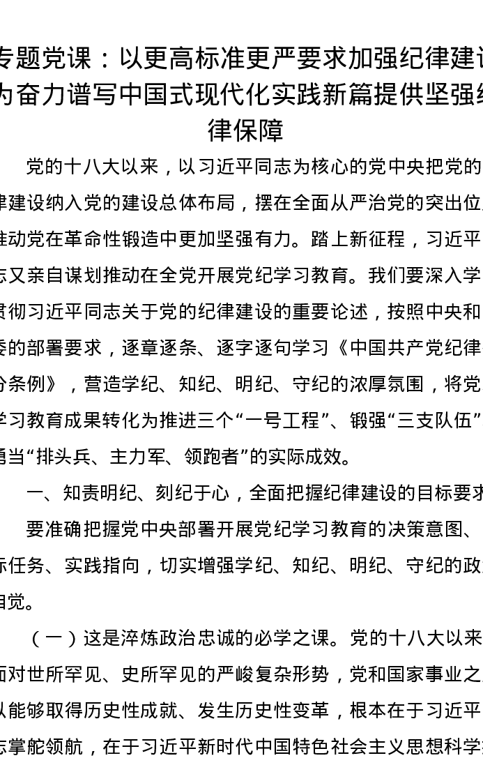 专题党课:以更高标准更严要求加强纪律建设,为奋力谱写中国式现代化实践新篇提供坚强纪律保障