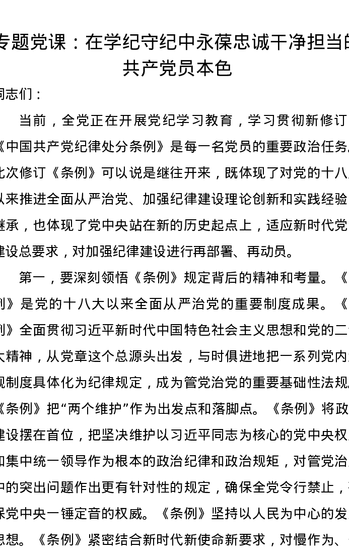 专题党课讲稿:在学纪守纪中永葆忠诚干净担当的共产党员本色