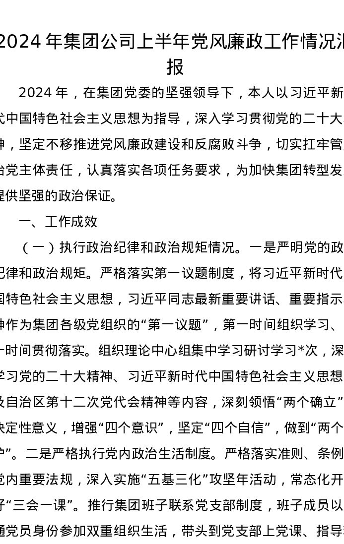 2024年集团公司上半年党风廉政工作情况汇报