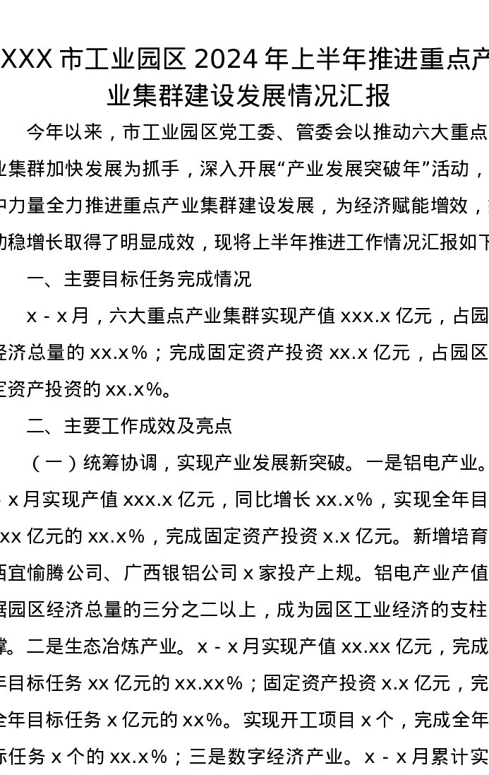 XXX市工业园区2024年上半年推进重点产业集群建设发展情况汇报