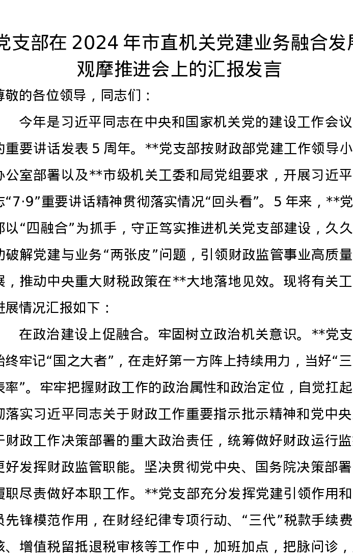 党支部在2024年市直机关党建业务融合发展观摩推进会上的汇报发言