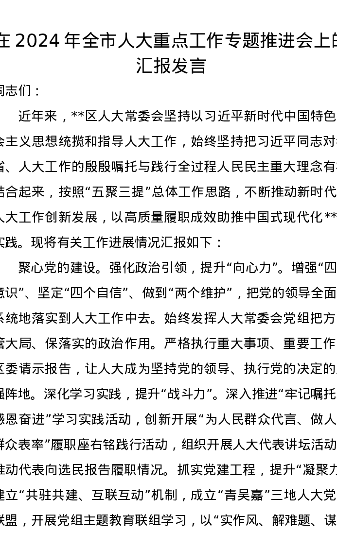 在2024年全市人大重点工作专题推进会上的汇报发言