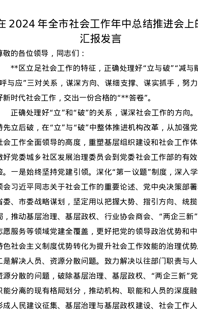 在2024年全市社会工作年中总结推进会上的汇报发言
