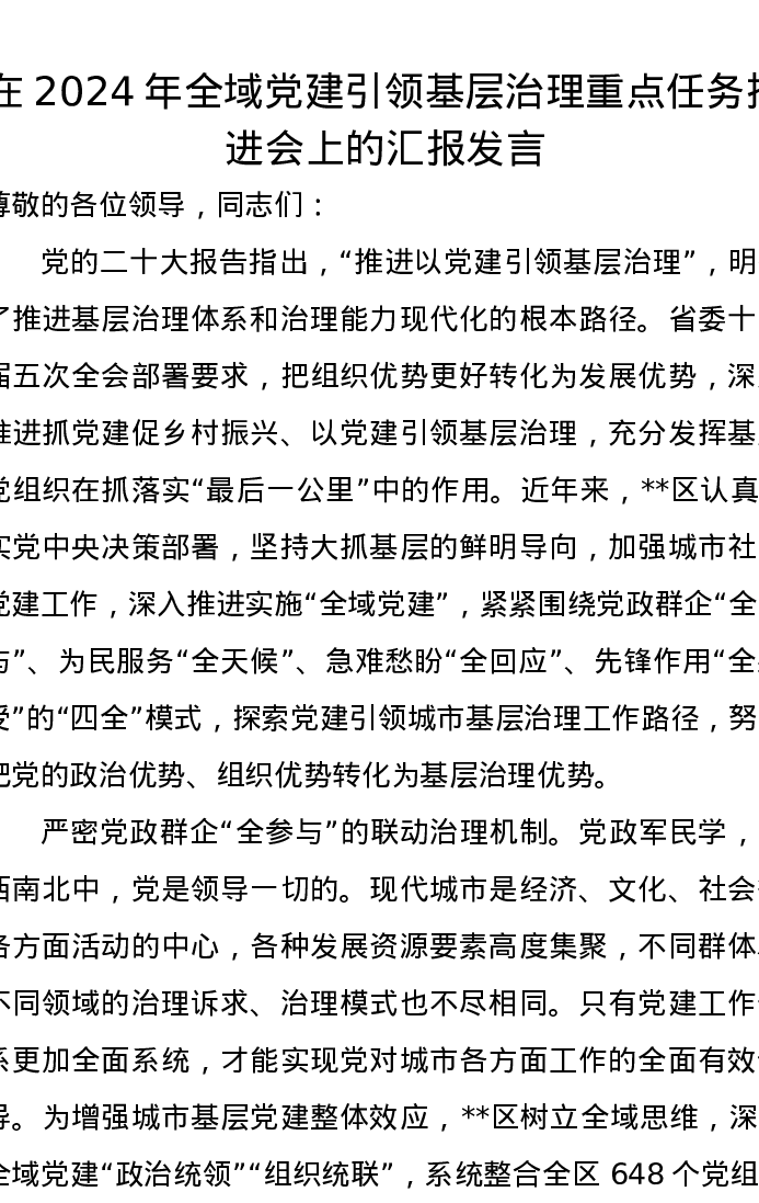 在2024年全域党建引领基层治理重点任务推进会上的汇报发言