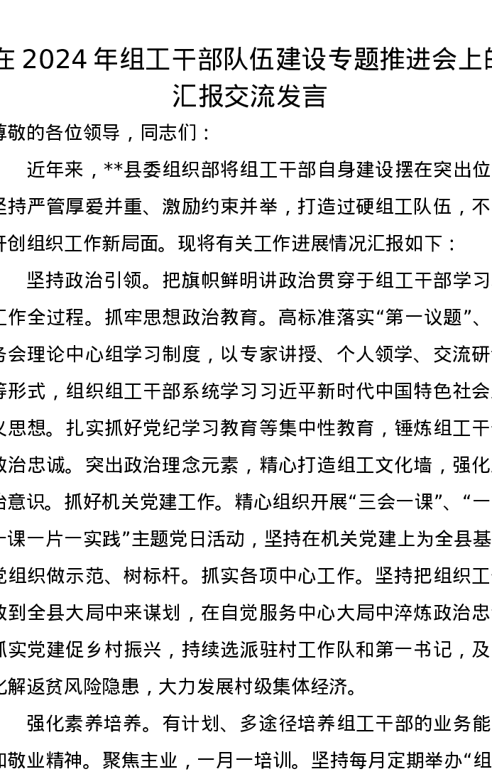 在2024年组工干部队伍建设专题推进会上的汇报交流发言