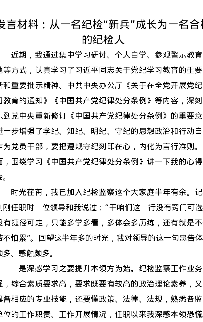 发言材料:从一名纪检“新兵”成长为一名合格的纪检人