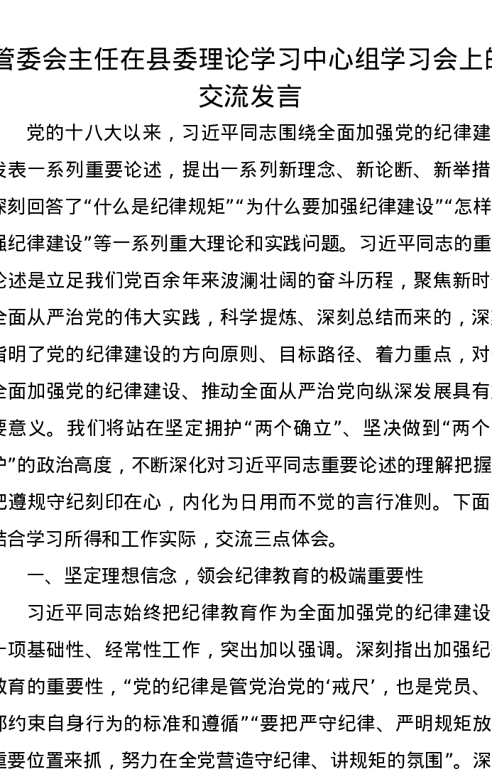 管委会主任在县委理论学习中心组学习会上的交流发言