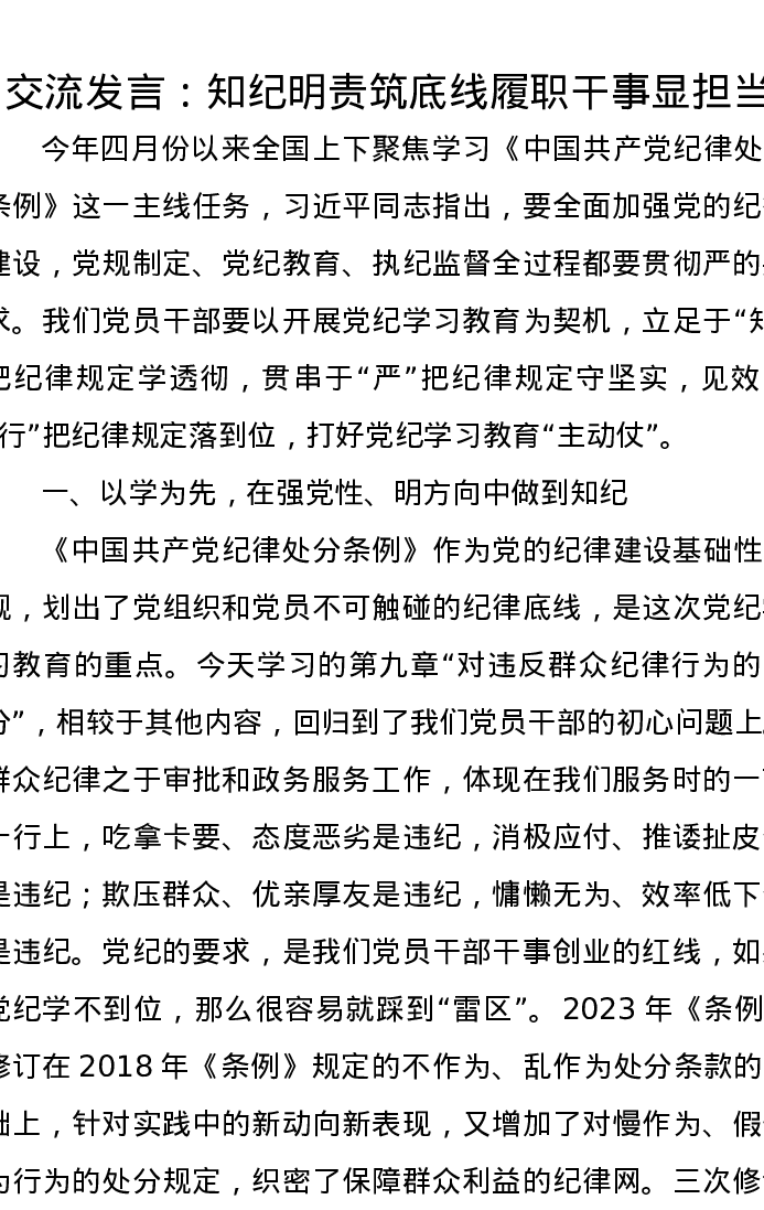 交流发言:知纪明责筑底线履职干事显担当