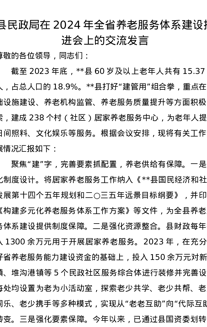 县民政局在2024年全省养老服务体系建设推进会上的交流发言