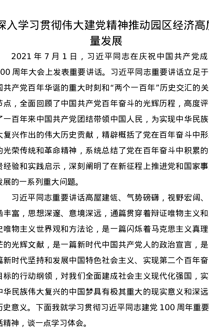 研讨发言:深入学习贯彻伟大建党精神推动园区经济高质量发展