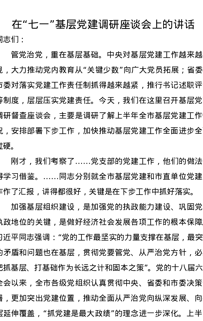 在“七一”基层党建调研座谈会上的讲话