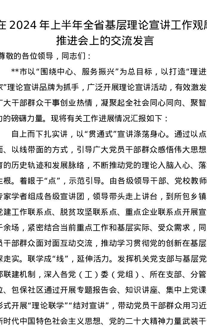 在2024年上半年全省基层理论宣讲工作观摩推进会上的交流发言