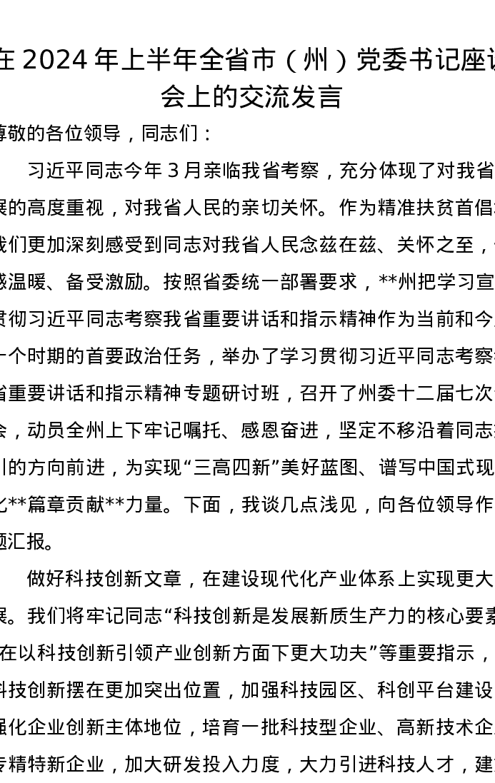 在2024年上半年全省市(州)党委书记座谈会上的交流发言