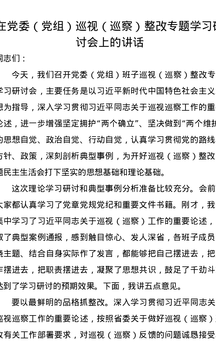 在党委(党组)巡视(巡察)整改专题学习研讨会上的讲话