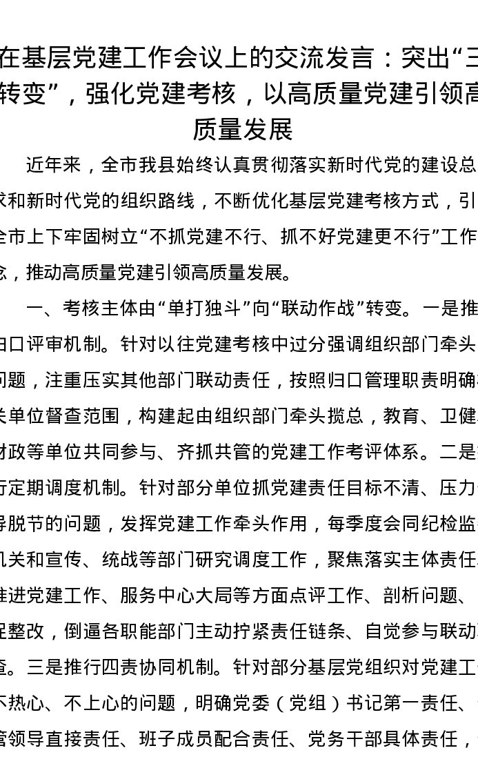 在基层党建工作会议上的交流发言:突出“三转变”,强化党建考核,以高质量党建引领高质量发展