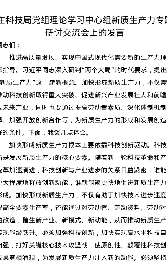 在科技局党组理论学习中心组新质生产力专题研讨交流会上的发言