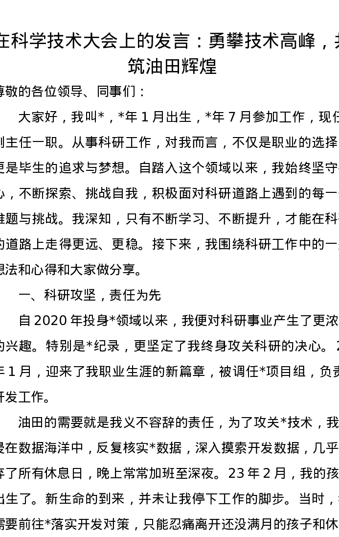 在科学技术大会上的发言:勇攀技术高峰,共筑油田辉煌