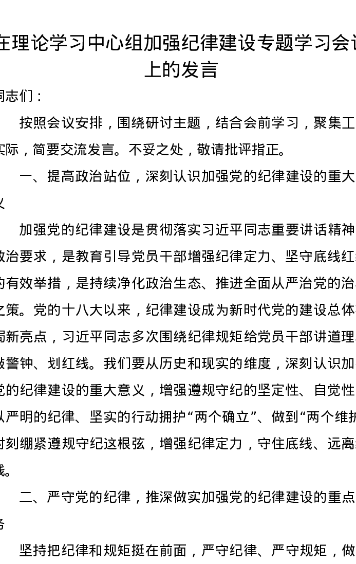 在理论学习中心组加强纪律建设专题学习会议上的发言