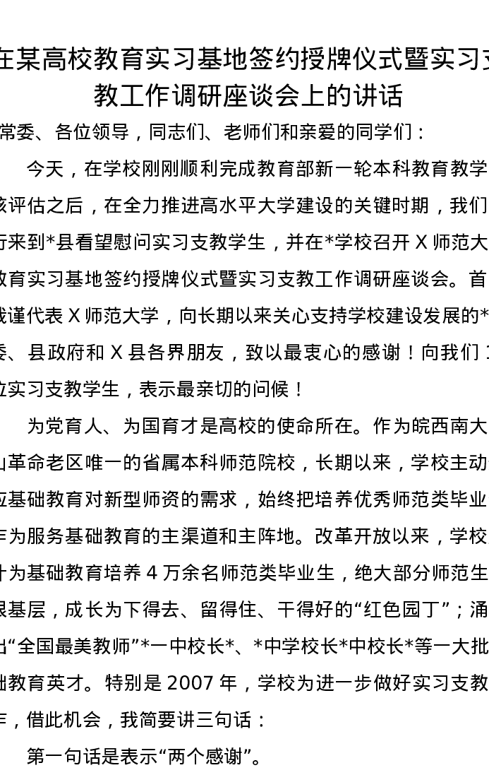 在某高校教育实习基地签约授牌仪式暨实习支教工作调研座谈会上的讲话