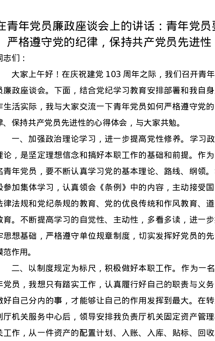 在青年党员廉政座谈会上的讲话:青年党员要严格遵守党的纪律,保持共产党员先进性