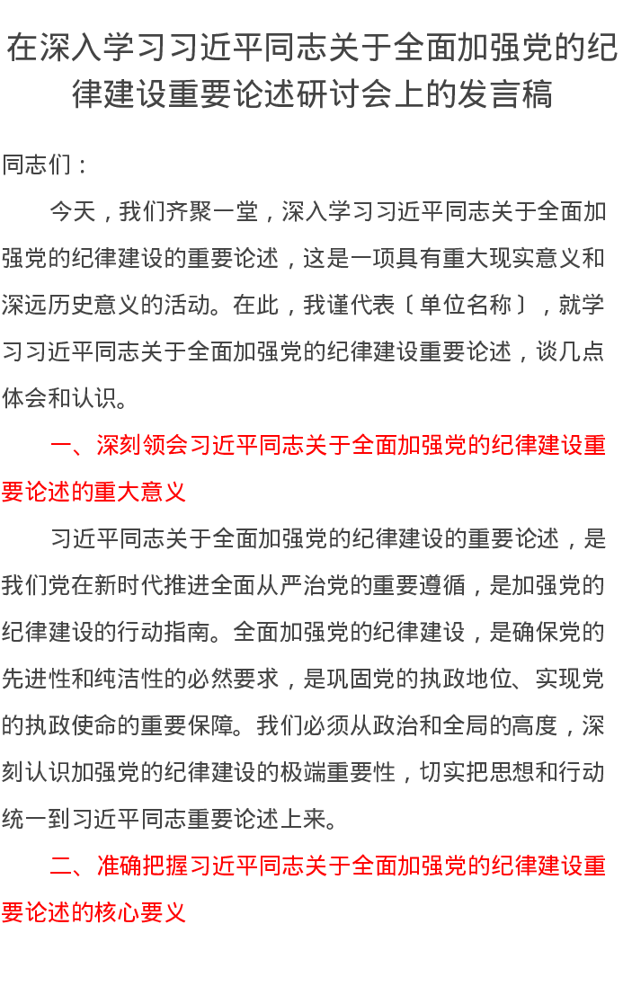 在深入学习习近平总书记关于全面加强党的纪律建设重要论述研讨会上的发言稿