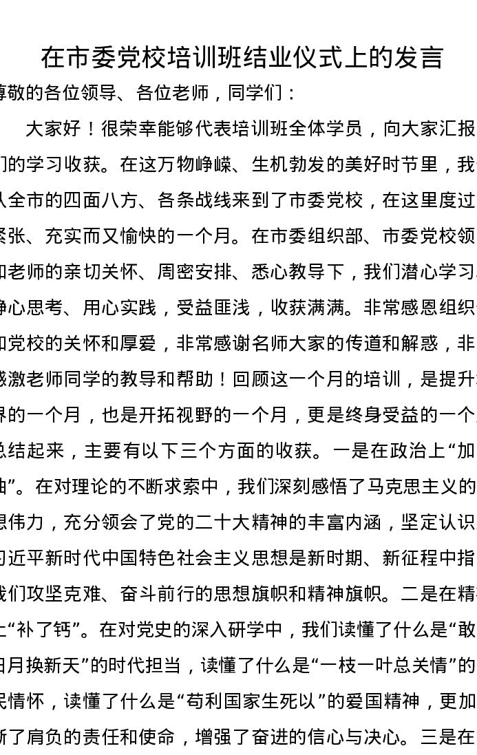 在市委党校培训班结业仪式上的发言