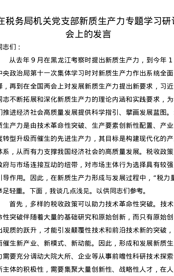 在税务局机关党支部新质生产力专题学习研讨会上的发言