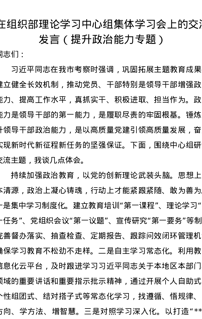 在组织部理论学习中心组集体学习会上的交流发言(提升政治能力专题)