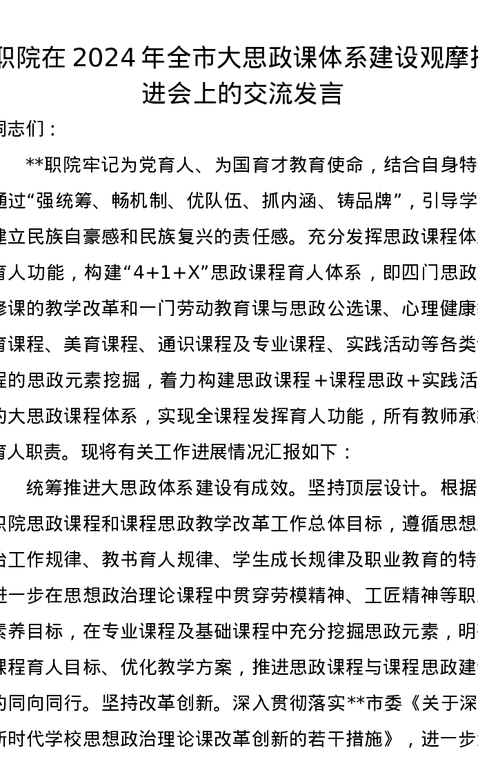 职院在2024年全市大思政课体系建设观摩推进会上的交流发言