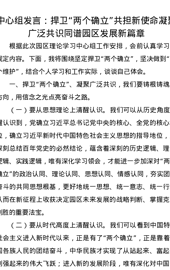 中心组发言:捍卫“两个确立”共担新使命凝聚广泛共识同谱园区发展新篇章