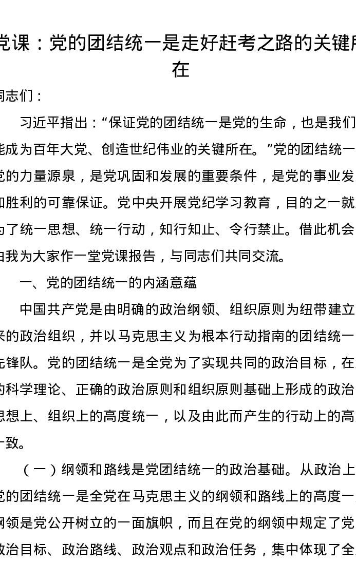 党课讲稿:党的团结统一是走好赶考之路的关键所在