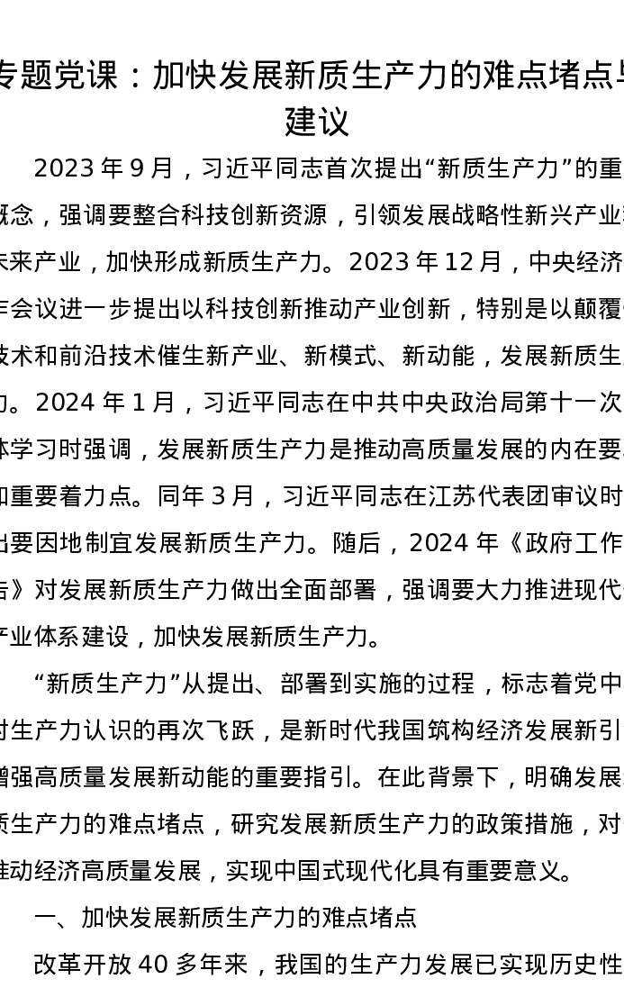 党课讲稿:加快发展新质生产力的难点堵点与建议