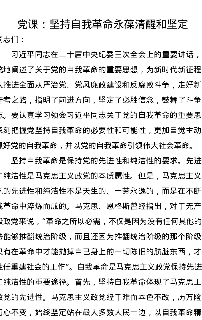 党课讲稿:坚持自我革命永葆清醒和坚定