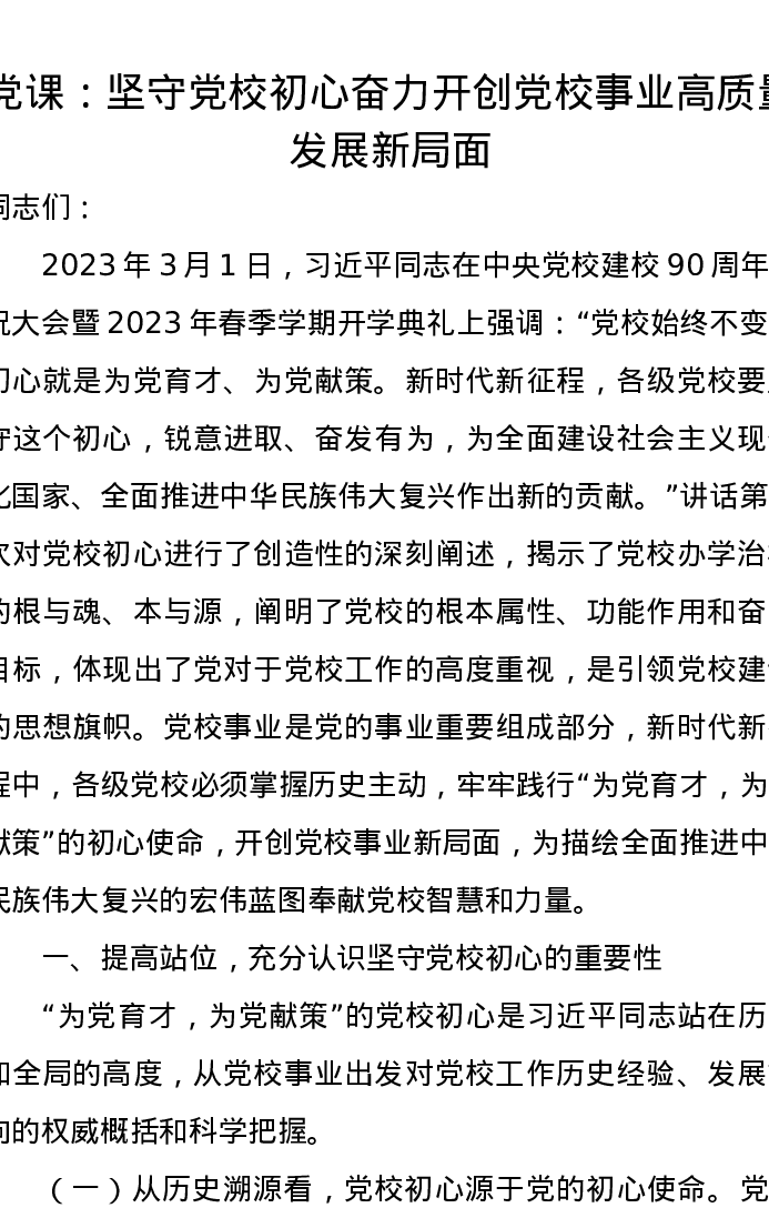 党课讲稿:坚守党校初心奋力开创党校事业高质量发展新局面