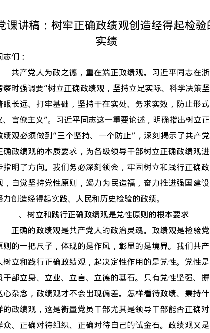党课讲稿:树牢正确政绩观创造经得起检验的实绩