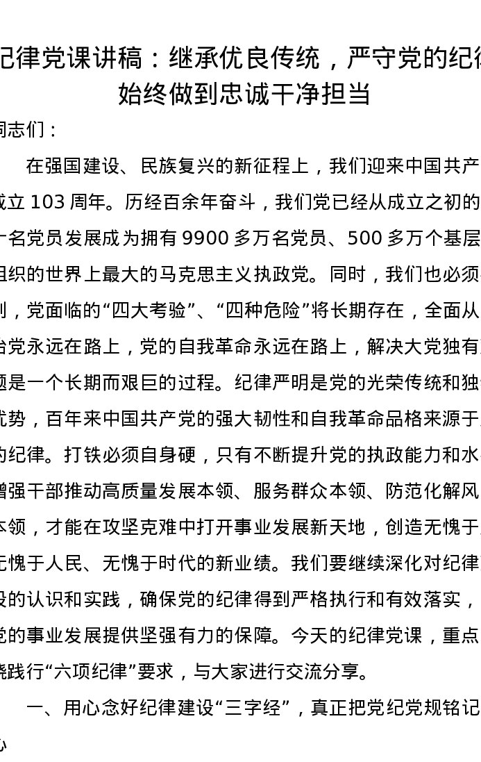 纪律党课讲稿:继承优良传统,严守党的纪律,始终做到忠诚干净担当