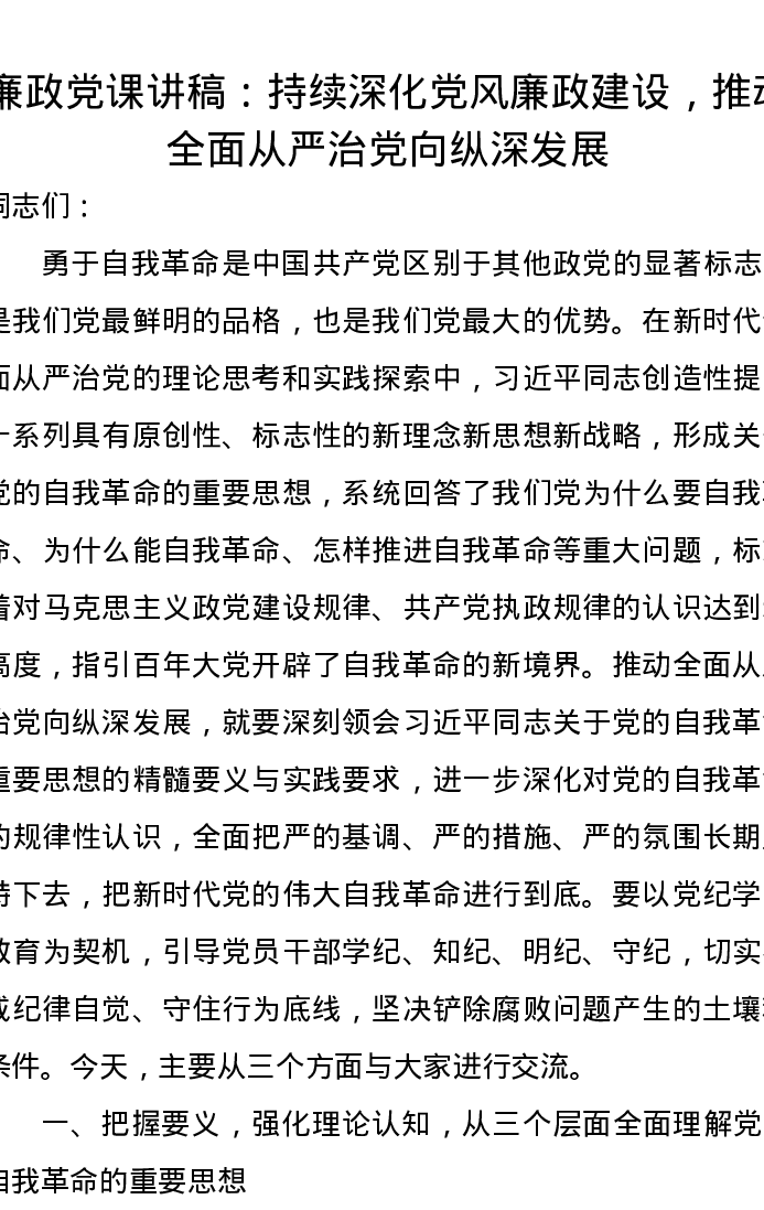 廉政党课讲稿:持续深化党风廉政建设,推动全面从严治党向纵深发展