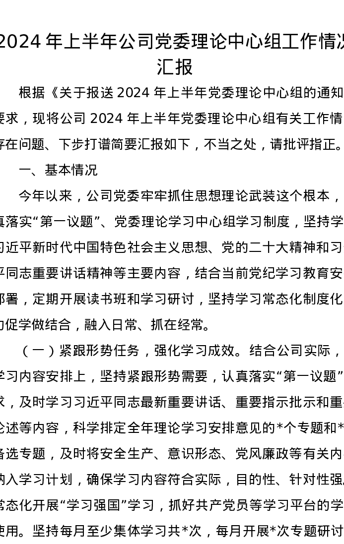 2024年上半年公司党委理论中心组工作情况汇报