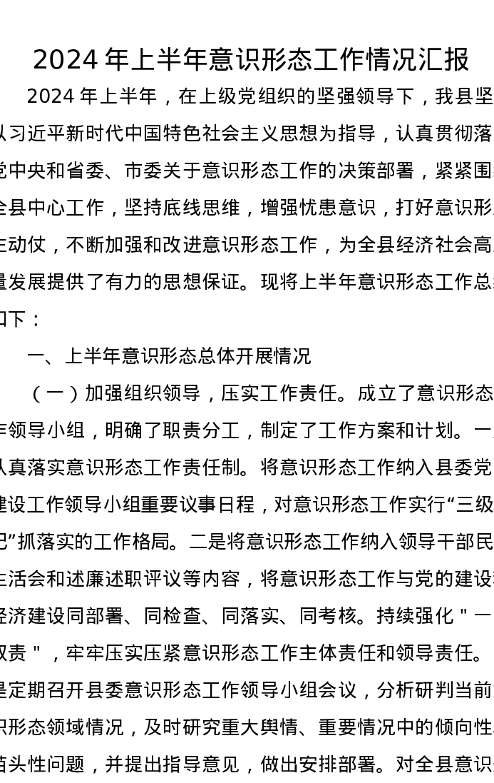 2024年上半年意识形态工作情况汇报