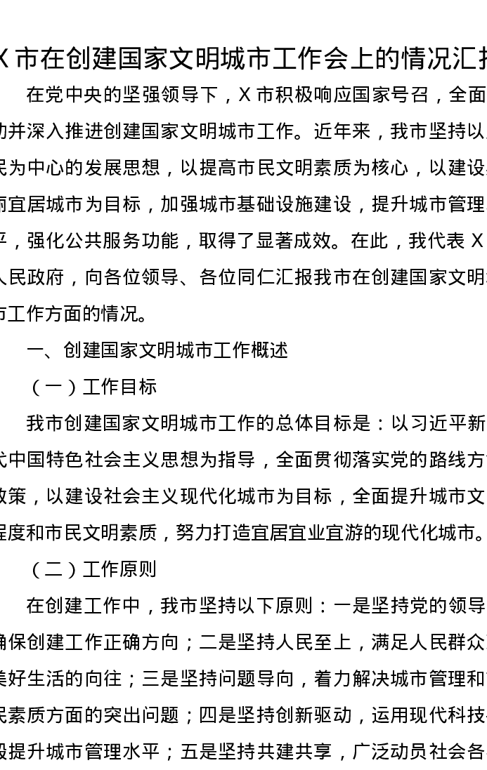 X市在创建国家文明城市工作会上的情况汇报